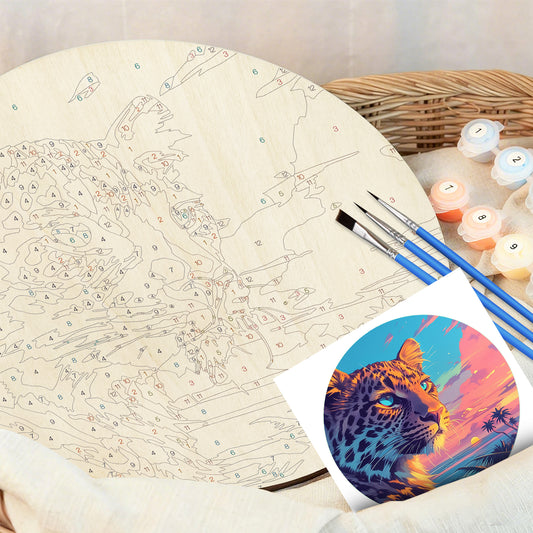 Fierce Leopard DIY. Paint by numbers on Wood Slice. 20cm.