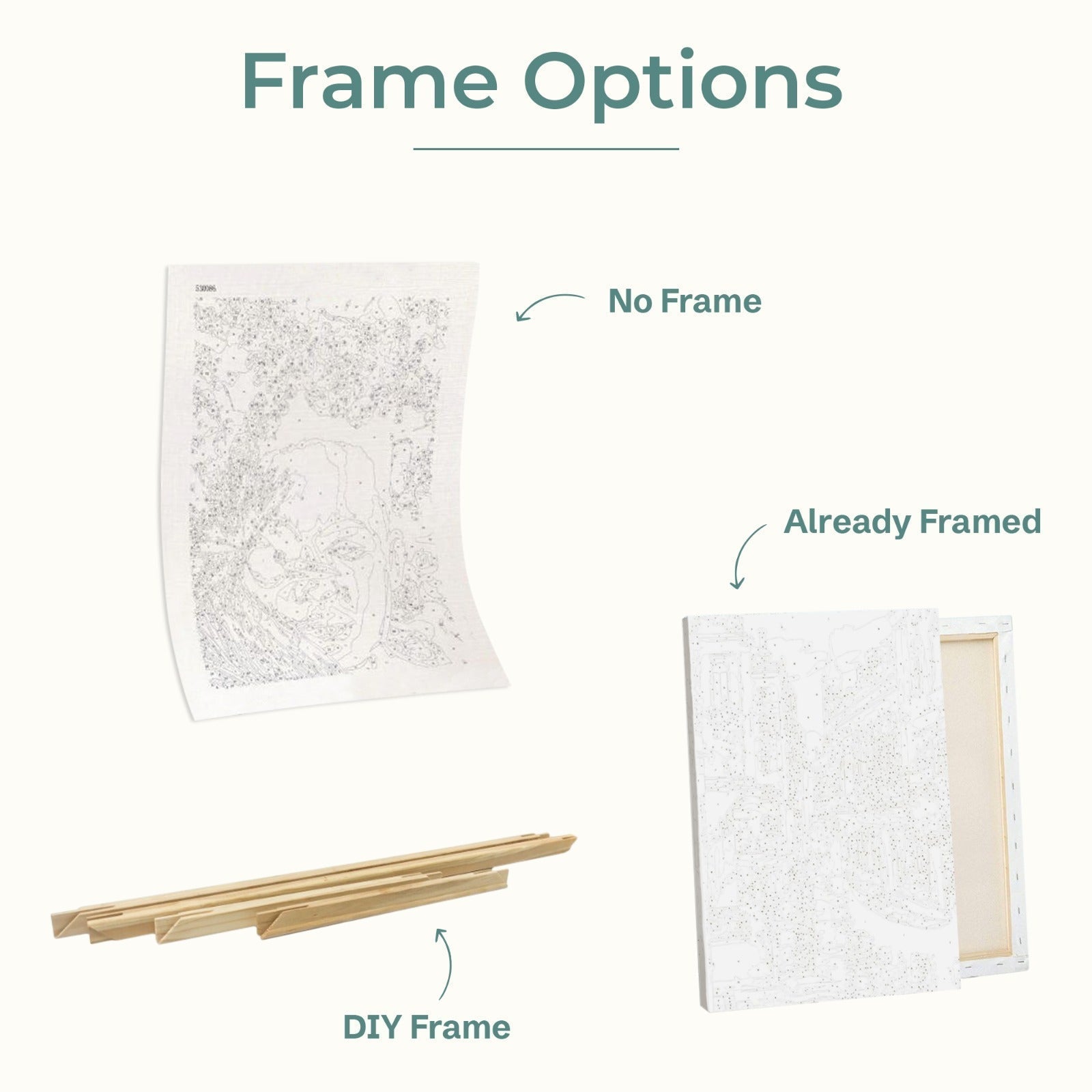 - Without Frame: If you would prefer to leave your masterpiece paint by numbers unframed or would like to browse for options outside our store, select this option. It's perfect for those who enjoy the flexibility of choosing their frame style later on.